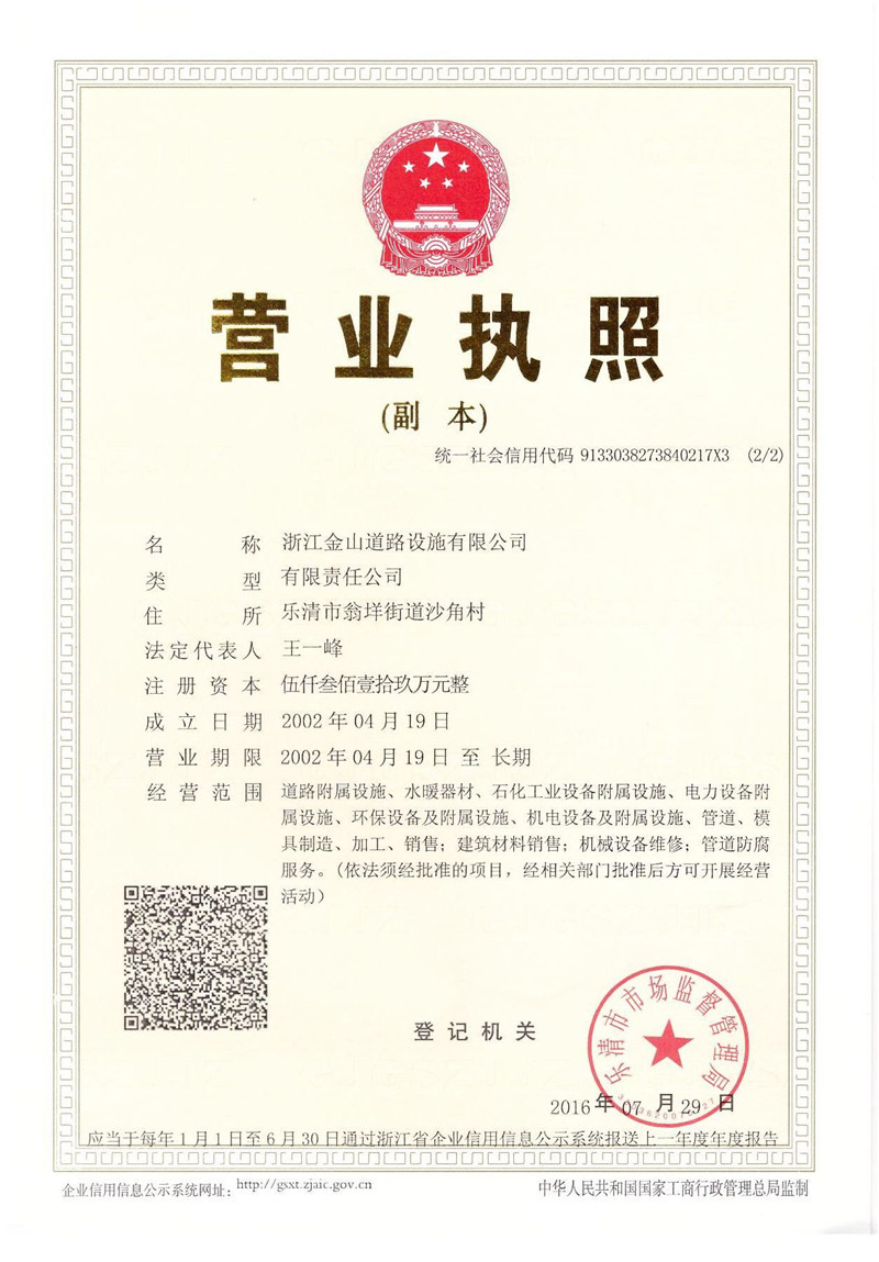 浙江金山道路设施有限公司,位于浙江省乐清市翁垟街道海屿金山工业园万翁中路882号。本公司成立于2002年,经过十几年的发展,现已初具规模。目前公司占地12亩,生产、生活用房2900M2,注册资金528万元,固定资产2000多万元,年生产量2123万多元。公司员工58人,其中中、高级技术人员8人。公司拥有全自动的SMC材料生产机组,配有大、中型多台液压机及检测维修设备。生产成品有BMC复合材料井盖、水箅系列,SMC复合材料井盖、水箅系列,球墨铸铁复合材料井盖、水箅系列等一百多种规格型号产品,基本能满足国内石油化工工程配套、市政道路建设、电力电信等工程所需用的各类复合材料产品。公司曾是2009年度中石化入围供应商。